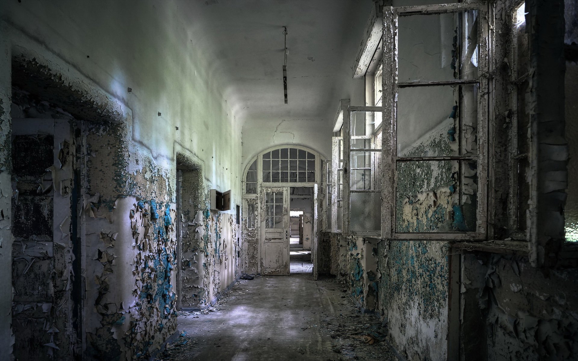 Altes verlassenes, gruseliges Gebäude mit Fenstern