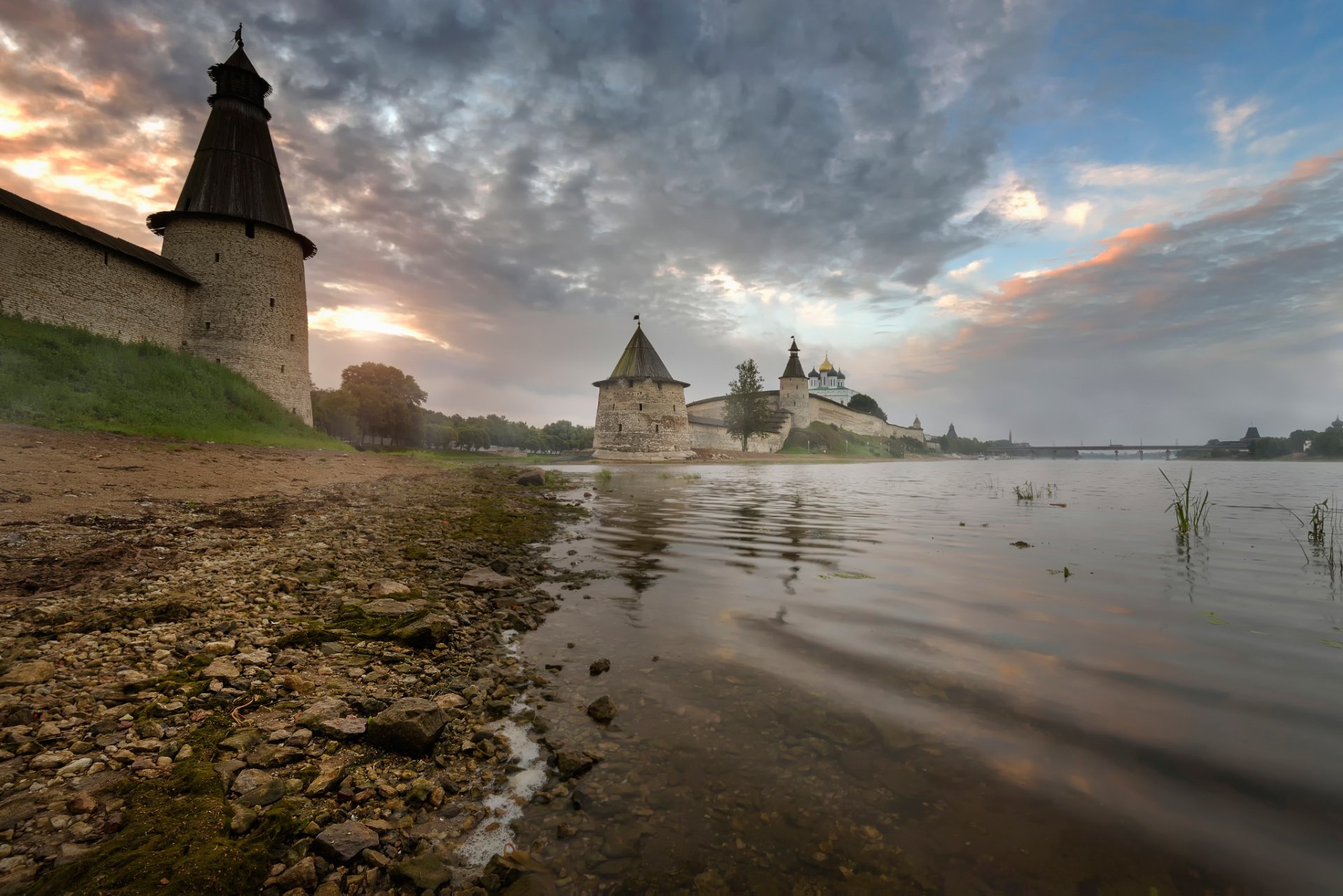 Morgendämmerung am Fluss mit Reflexion auf glatter Wasseroberfläche
