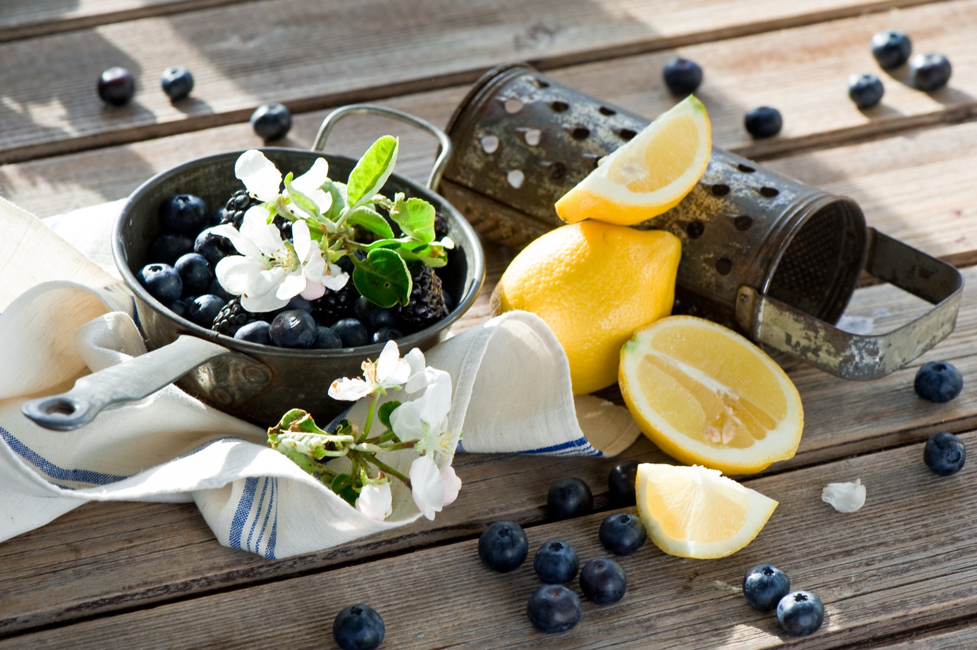 Stillleben von heidelbeeren und zitrone auf dem tischStillleben von Heidelbeeren und Zitrone auf dem Tisch