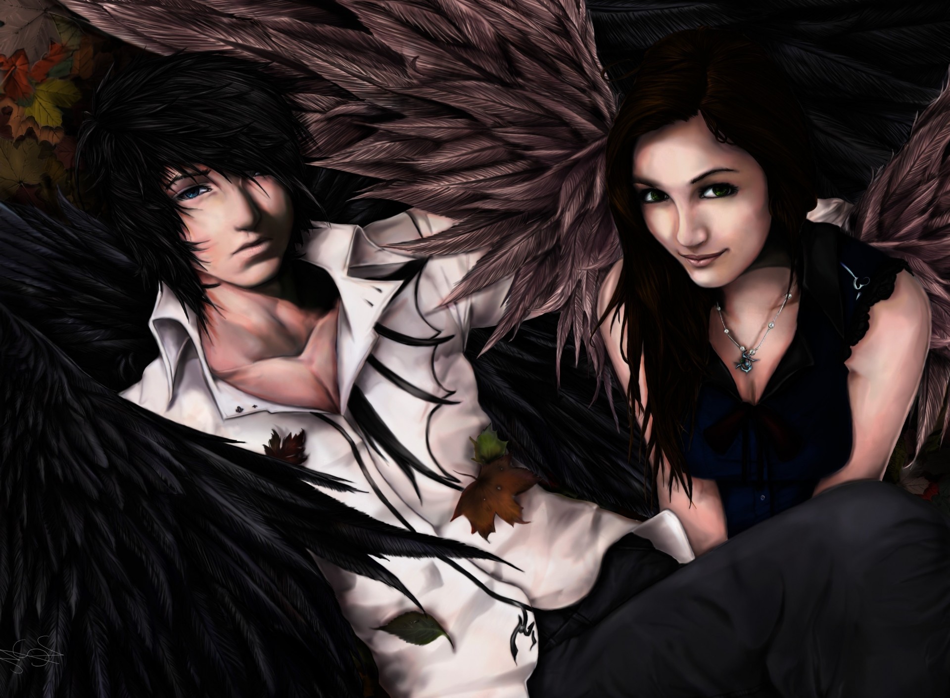 Kunst Mädchen und Kerl mit Flügeln in verschiedenen Farben