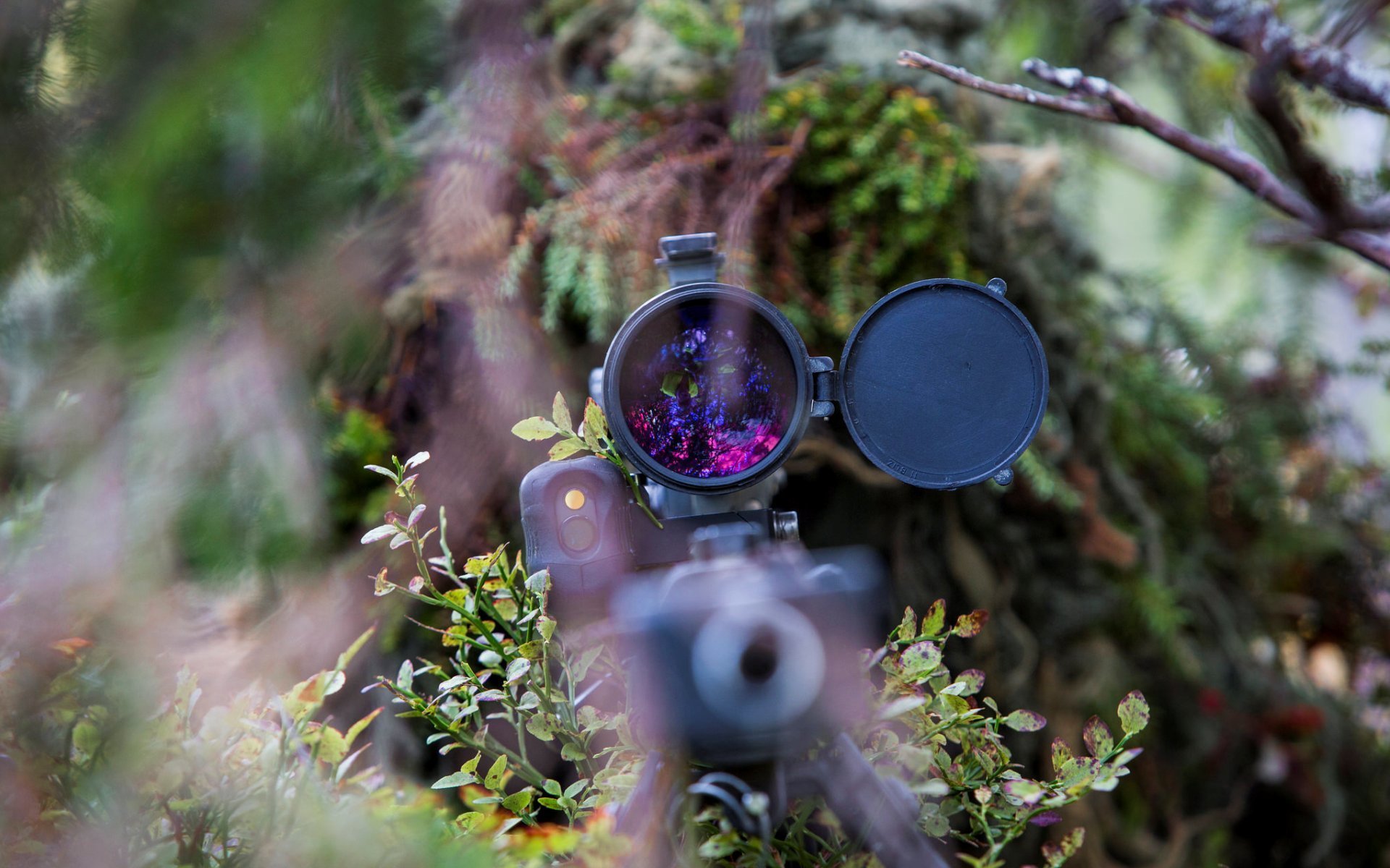 Ein Soldat mit einer Waffe sitzt in einem Versteck