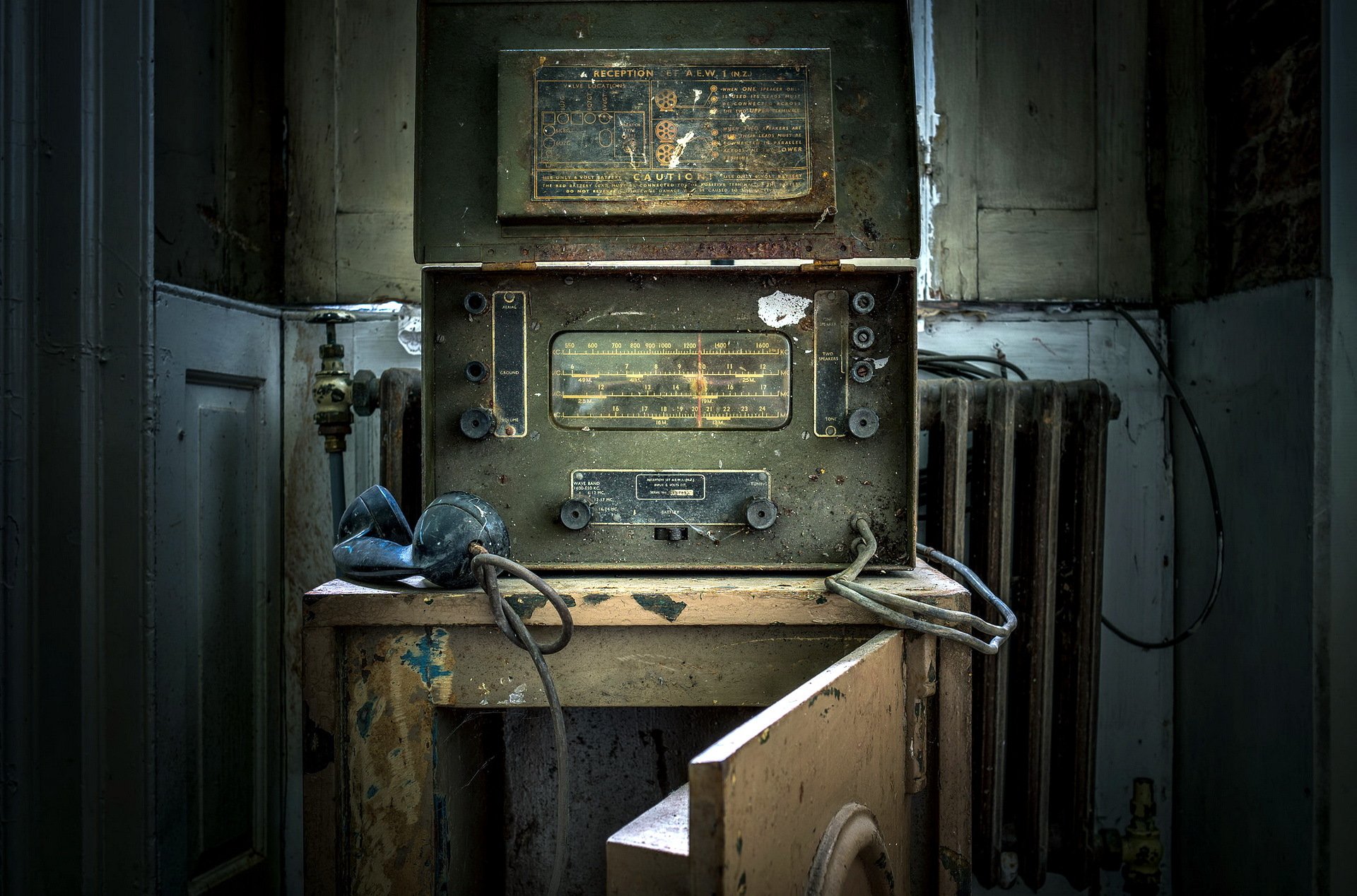 Ein auf dem Dachboden verlassenes Gerät, das aus einem Radio, einem Empfänger und einem Plattenspieler besteht