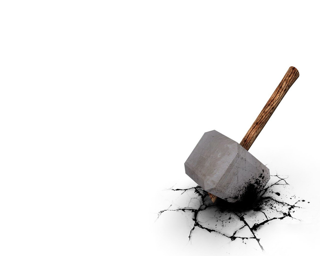 Gefallener hammer mit rissen auf weißem hintergrundGefallener Hammer mit Rissen auf weißem Hintergrund