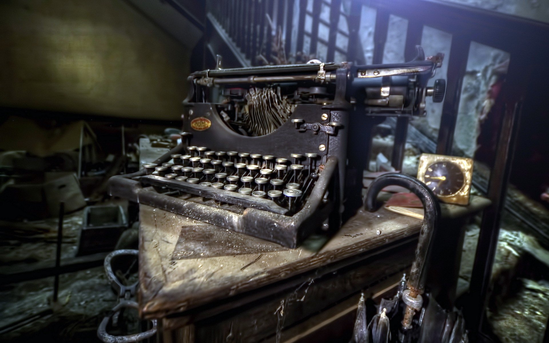 Alte seltene Schreibmaschine mit Uhr auf dem Hintergrund der Treppe