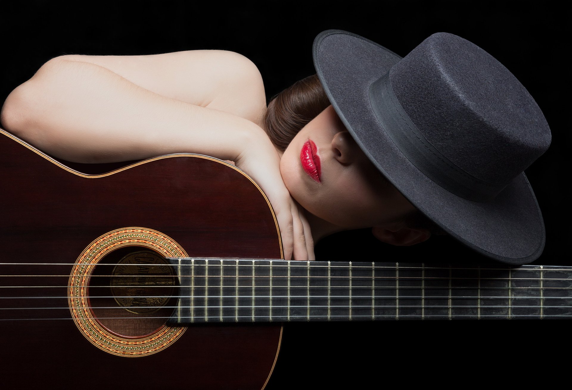 Ein elegantes braunhaarige mädchen in einem burgunderfarbenen abendkleid in langen ohrringen und rotem lippenstift vor dem hintergrund eines mannes mit mantel und hut