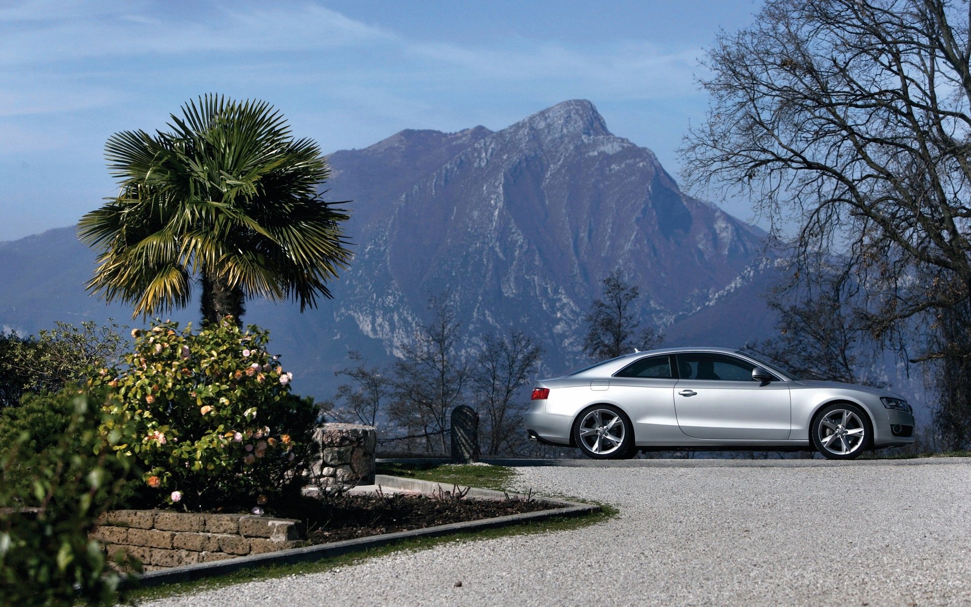 Ein grauer Audi steht vor dem Hintergrund der Berge