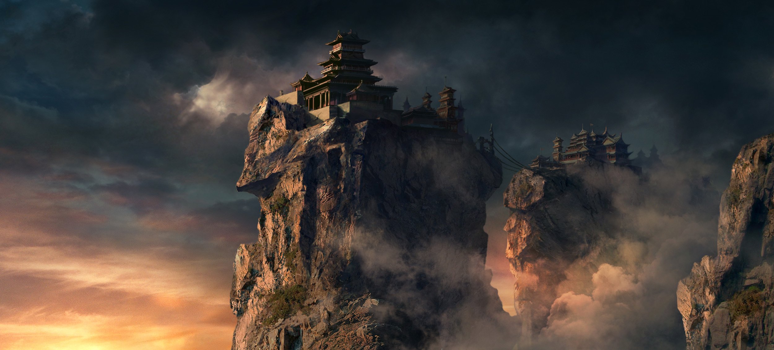 Kunst, Feng Liu , Tempel auf den Felsen und eine Seilbrücke