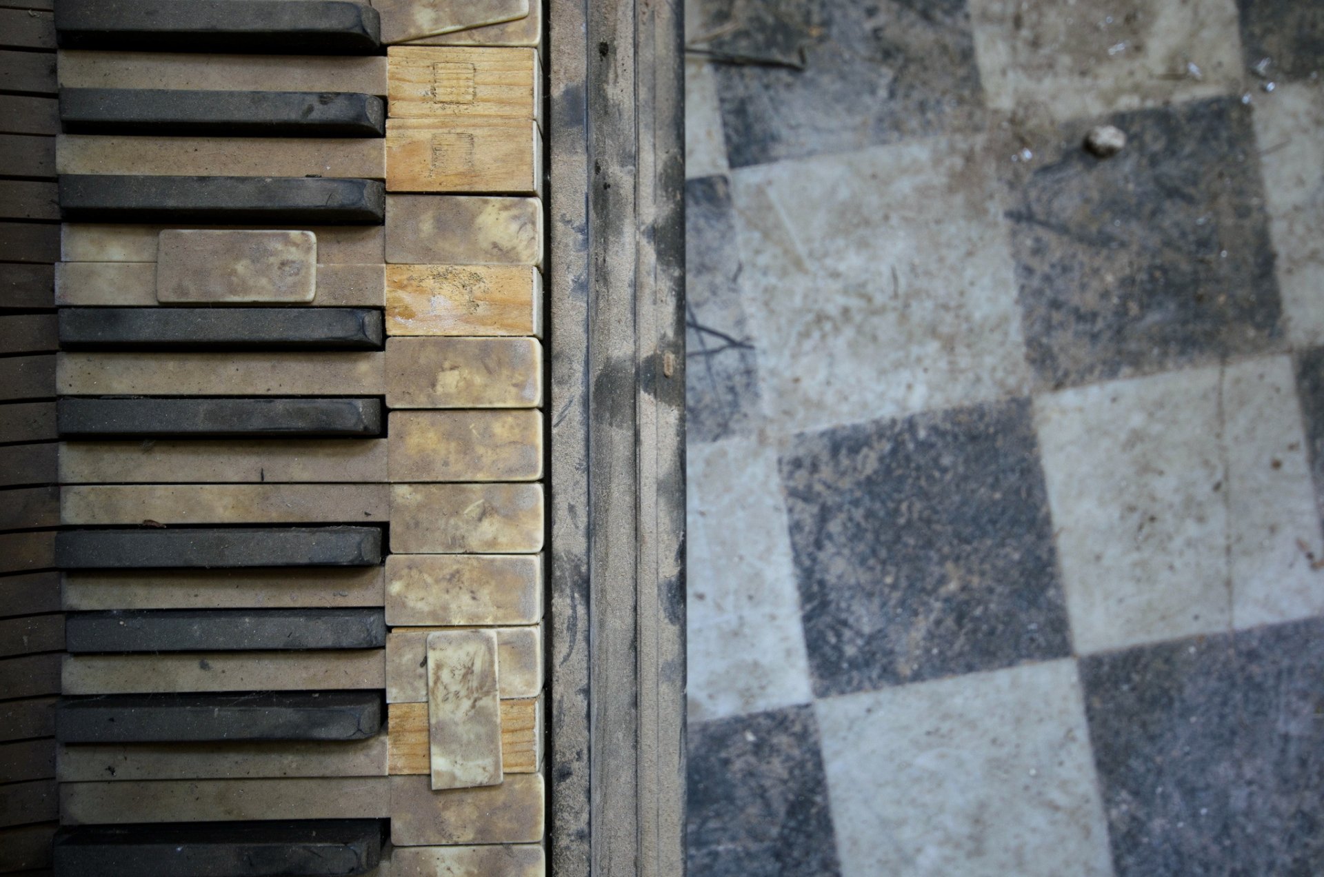 Musikinstrumente auf einem kleiderbügel auf grauem hintergrundMusikinstrumente auf einem Kleiderbügel auf grauem Hintergrund