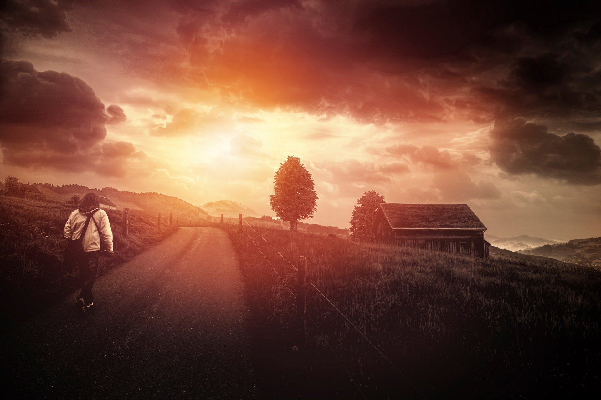 Ein baum in der nähe der straße. der weg führt in die wolkenEin Baum in der Nähe der Straße. Der Weg führt in die Wolken