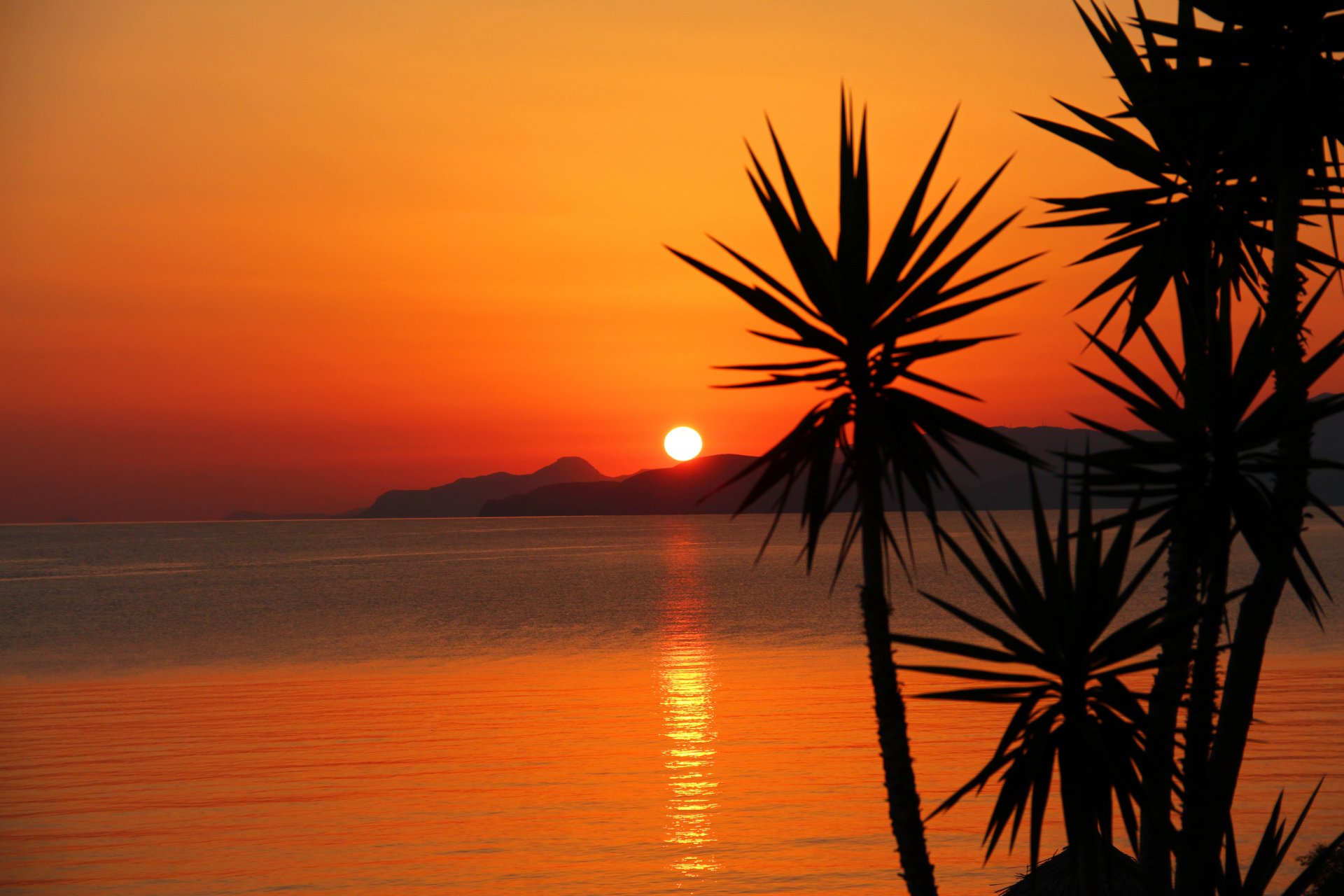 Die palmen werden vor dem hintergrund des sonnenuntergangs silutiertDie Palmen werden vor dem Hintergrund des Sonnenuntergangs silutiert