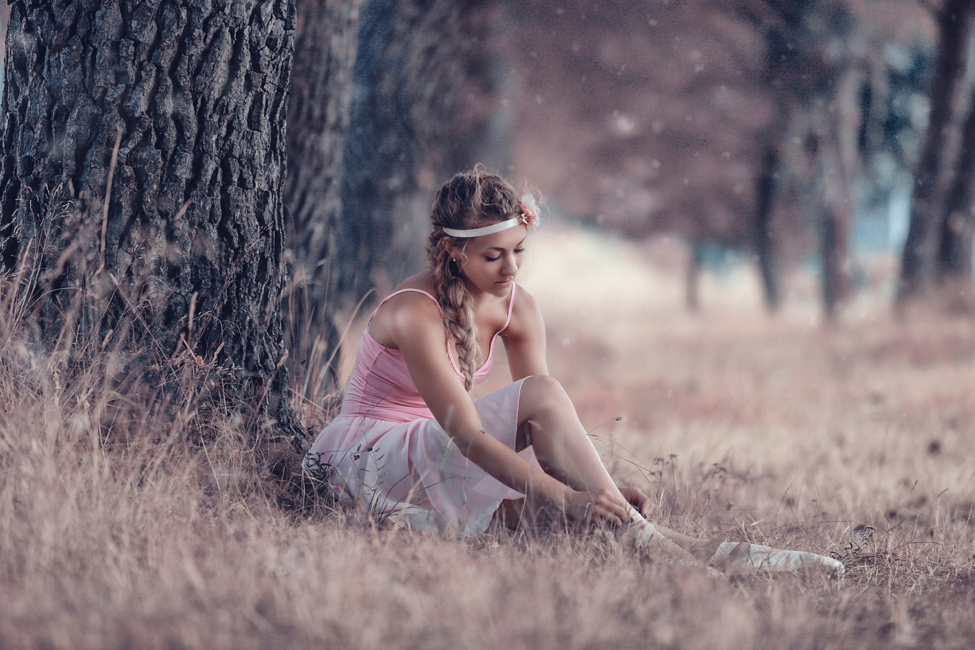 Mädchen Ballerina sitzt am Baum und trägt Spitzenschuhe