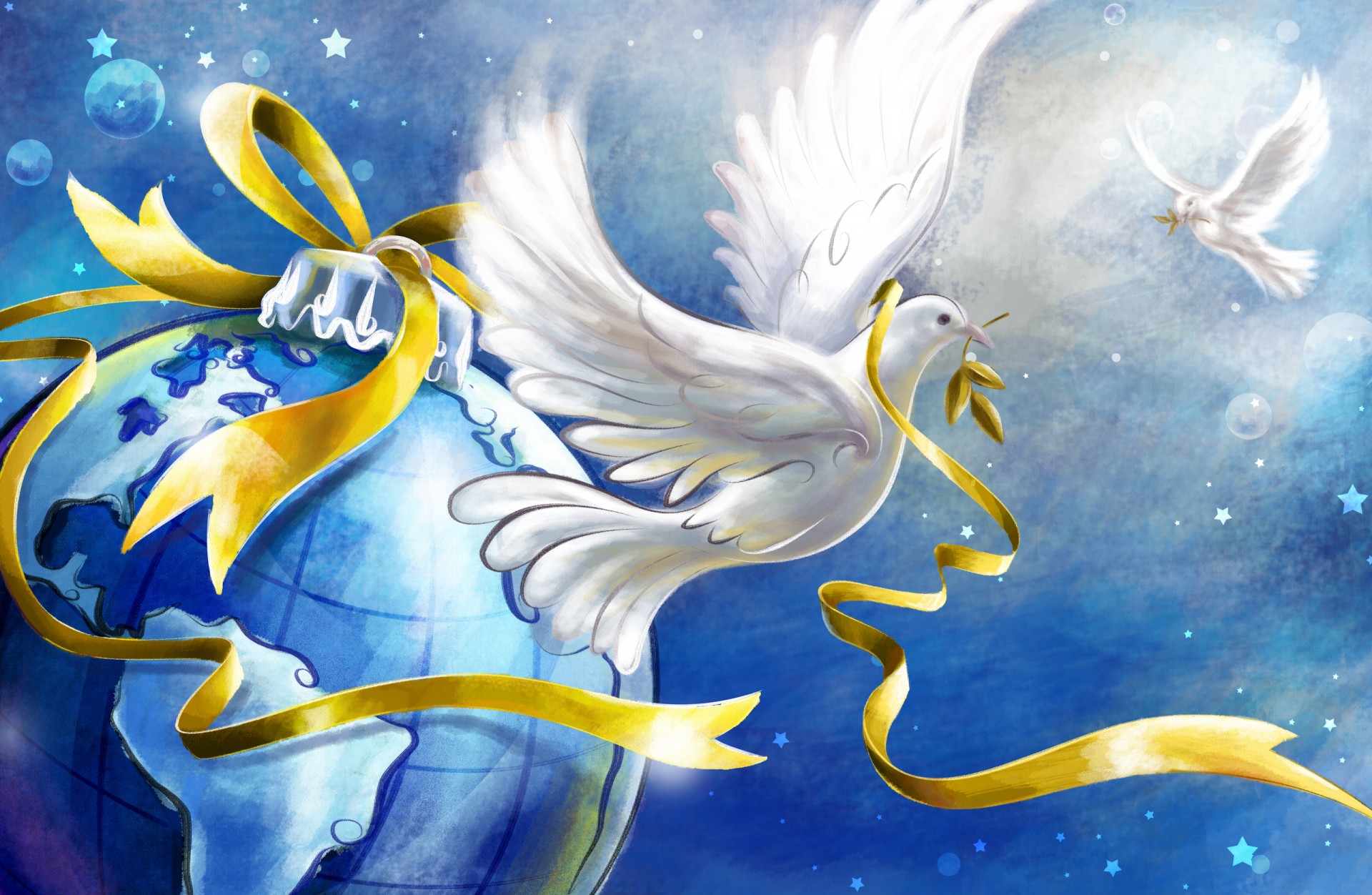 Eine taube trägt ein friedensband aus einer weihnachtskugel im schnabelEine Taube trägt ein Friedensband aus einer Weihnachtskugel im Schnabel