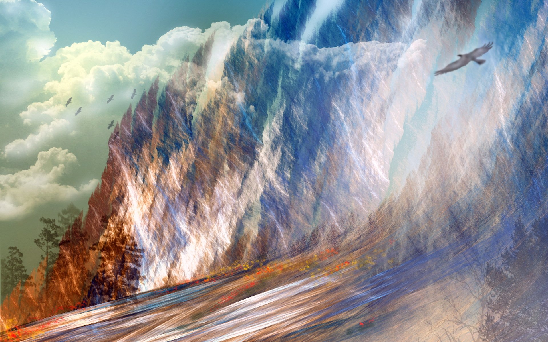 Malerei mit landschaft des sees und der bäume auf sonnenuntergang hintergrundMalerei mit Landschaft des Sees und der Bäume auf Sonnenuntergang Hintergrund