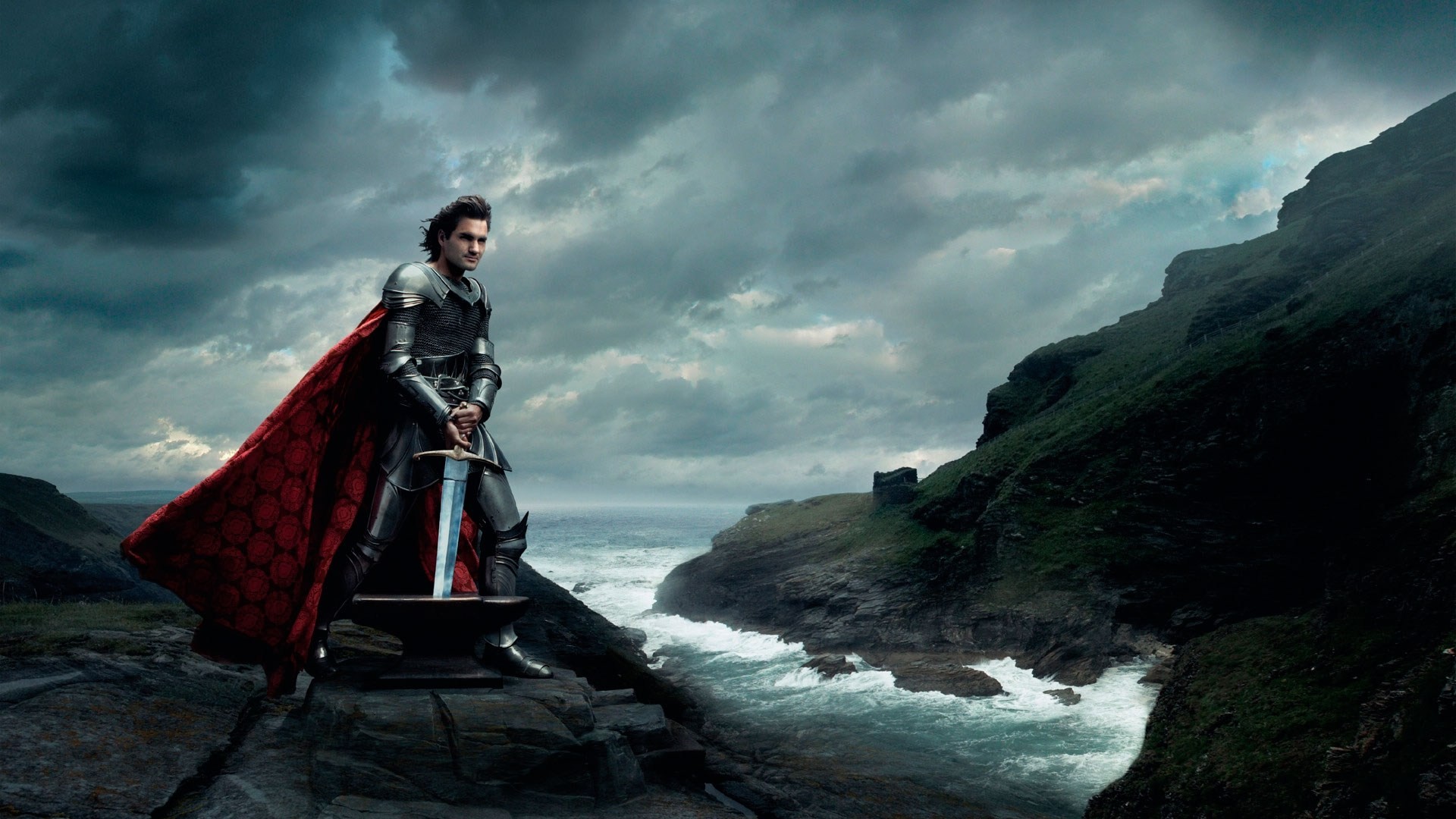 Ein Mann mit einem Schwert auf einem Berg in der Nähe eines Flusses