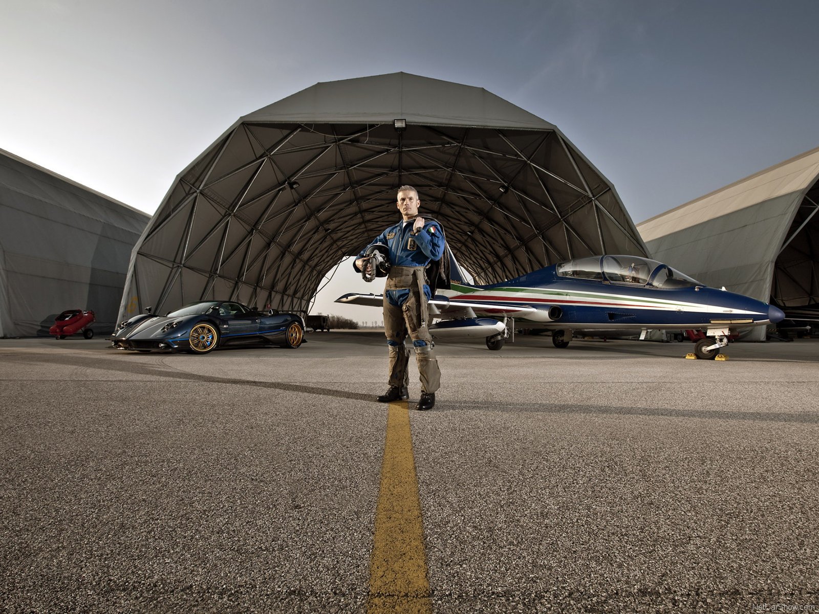 Pilot im Hintergrund eines Flugzeugs und eines Sportwagen