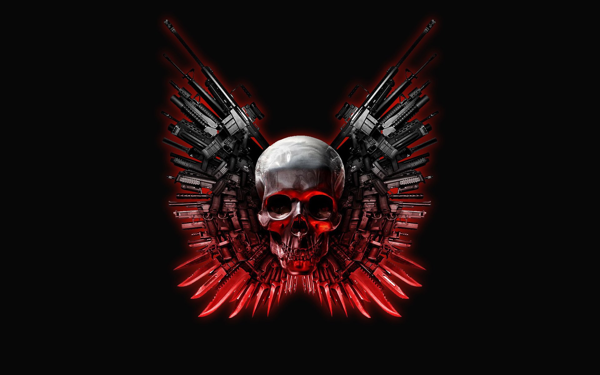 Schädel mit einem kranz aus messern auf schwarzem hintergrundSchädel mit einem Kranz aus Messern auf schwarzem Hintergrund