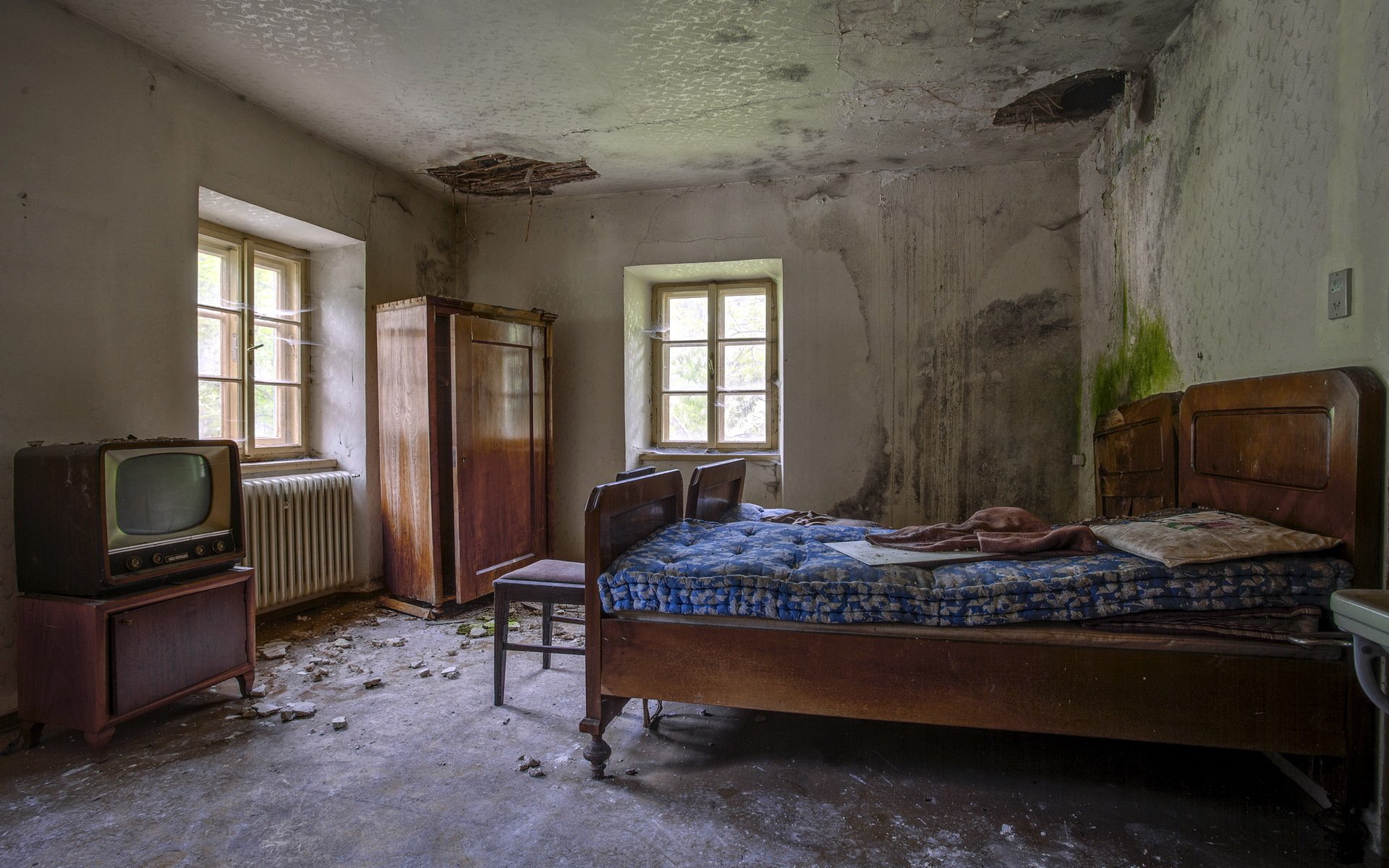 Das schlafzimmer hat einen stuhl, einen tisch, ein bett und ein gemäldeDas Schlafzimmer hat einen Stuhl, einen Tisch, ein Bett und ein Gemälde