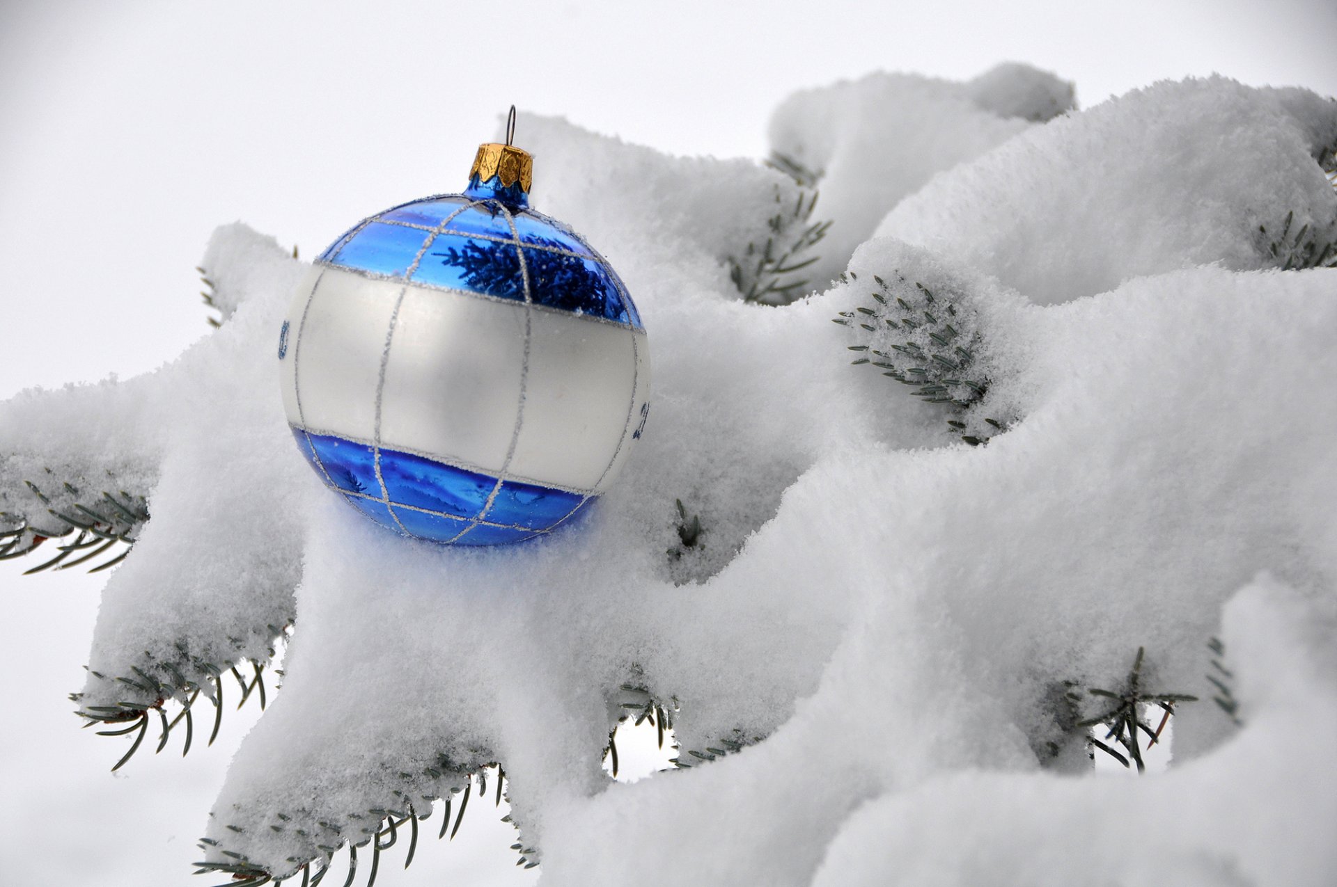 Weiß-blaue Kugel auf einem Christbaumzweig im Schnee