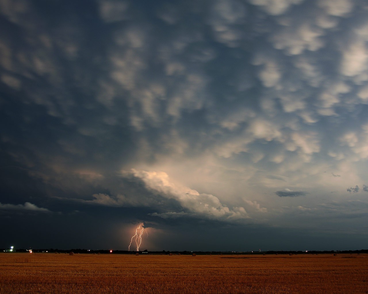 Über der Nachtstadt durchschneidet ein Blitz einen dicken Schleier von braunen Wolken
