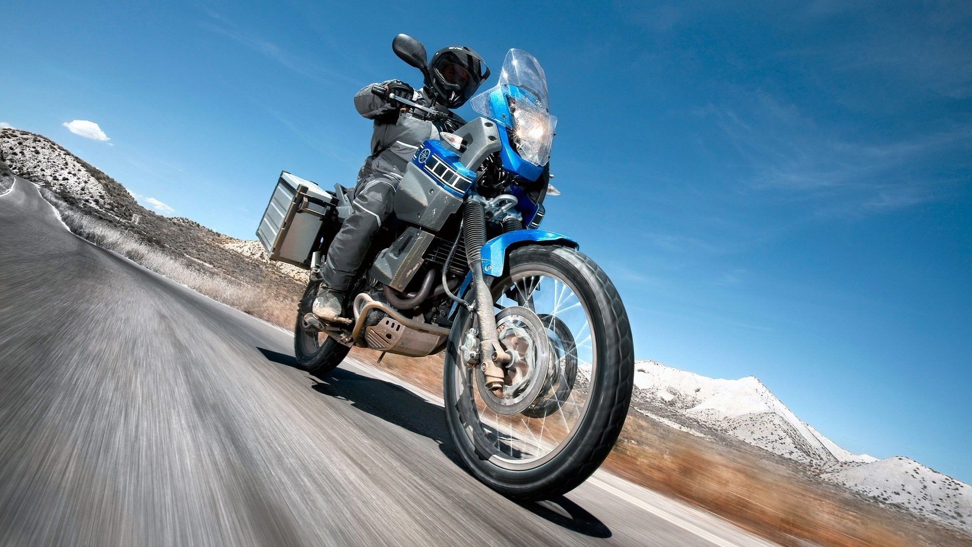 Ein steiler biker gewinnt an geschwindigkeit auf einem motorradEin steiler Biker gewinnt an Geschwindigkeit auf einem Motorrad