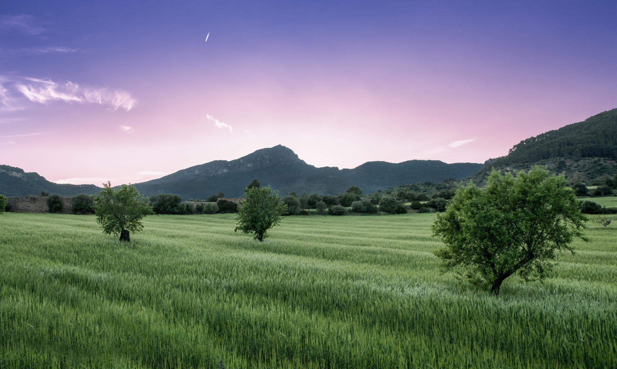 Grünes feld auf dem hintergrund des berges und lila himmelGrünes Feld auf dem Hintergrund des Berges und lila Himmel