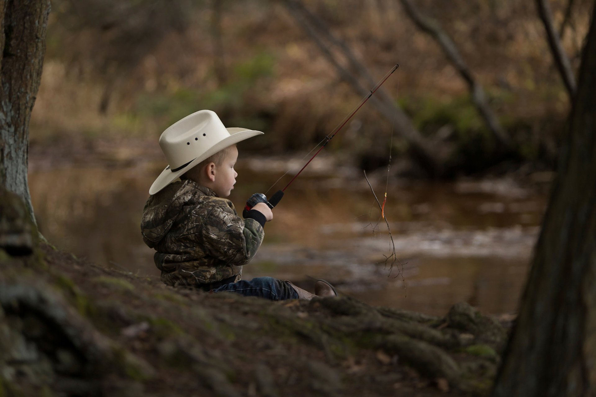 Ein kleinkind mit einem hut mit einer angelrute sitzt am uferEin Kleinkind mit einem Hut mit einer Angelrute sitzt am Ufer