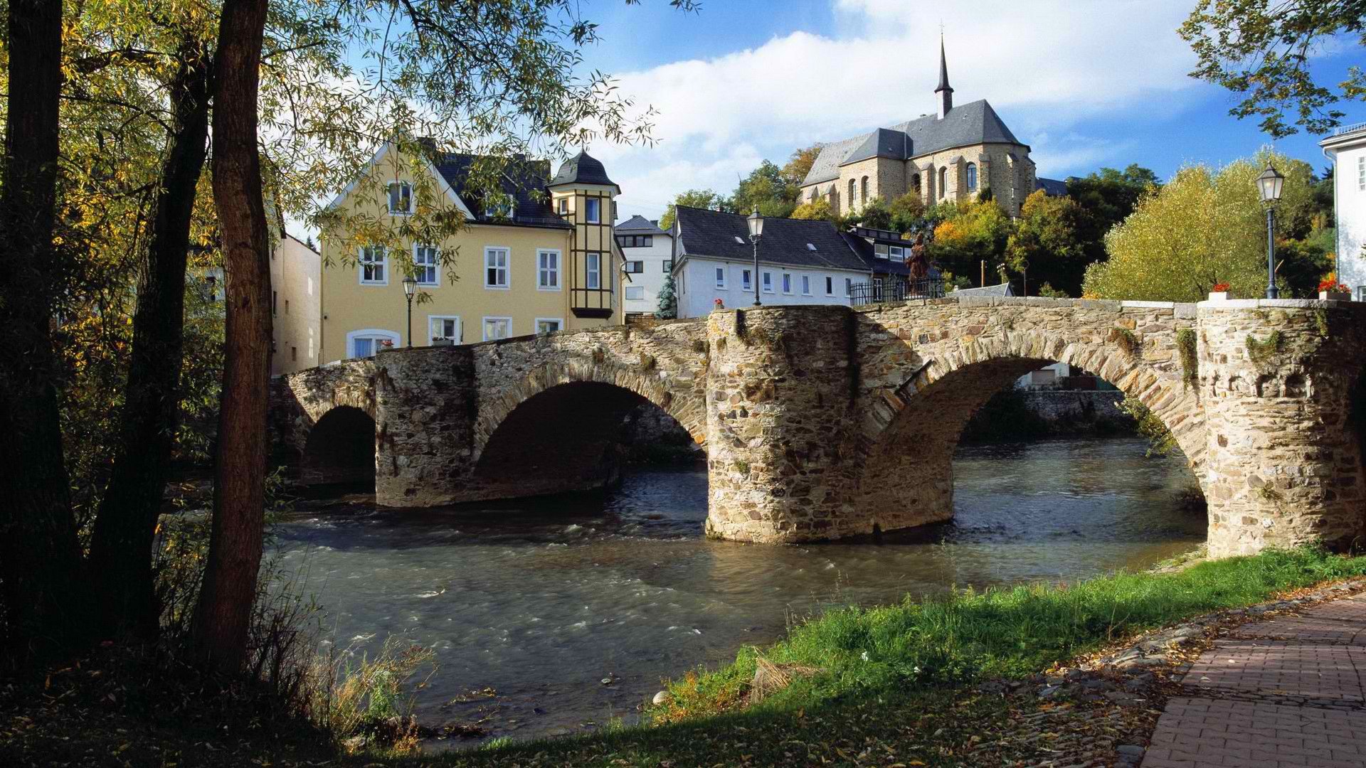 Eine gemütliche ecke der natur, eine brücke, die im wald über den fluss führtEine gemütliche Ecke der Natur, eine Brücke, die im Wald über den Fluss führt