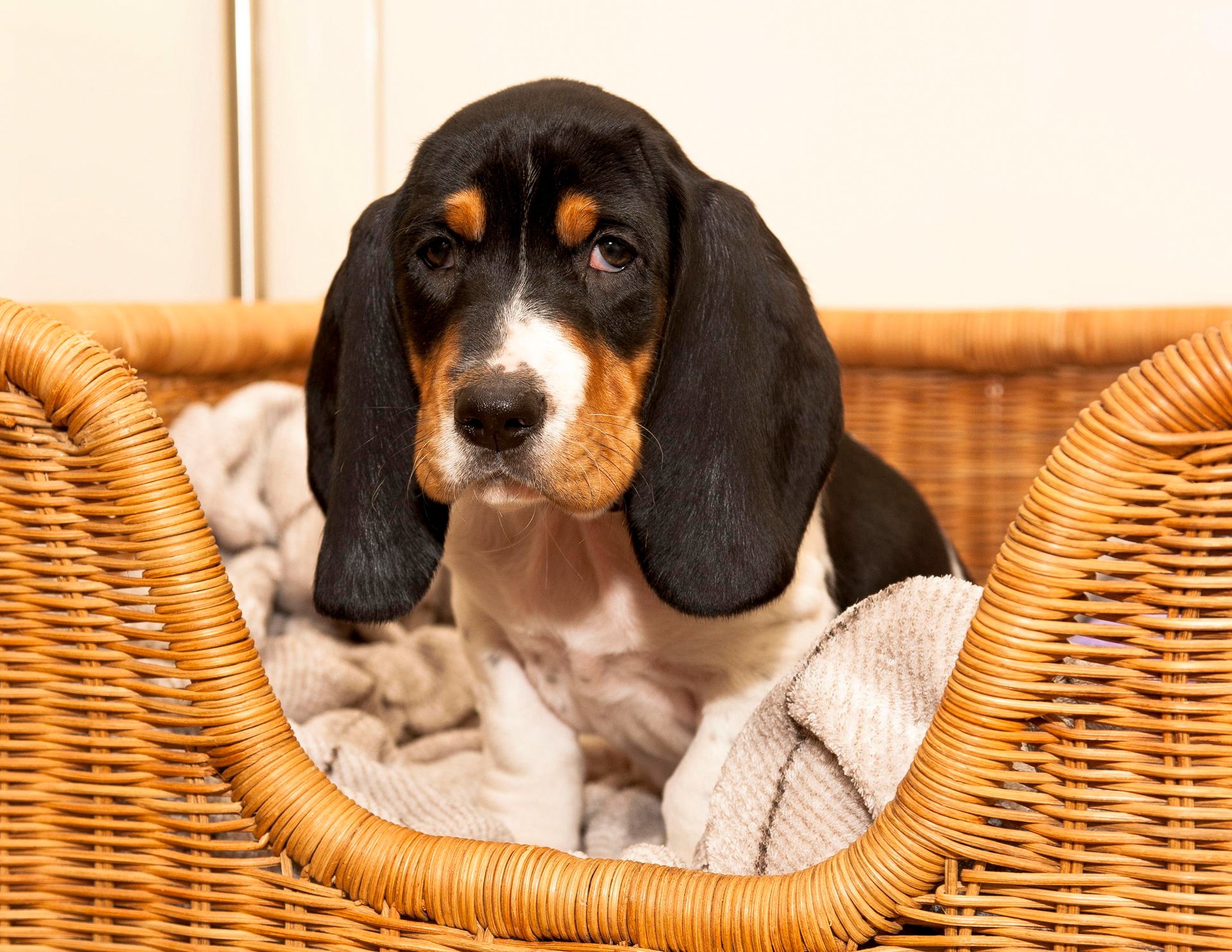 Zärtlich gefleckter Welpe mit rotem Halsband