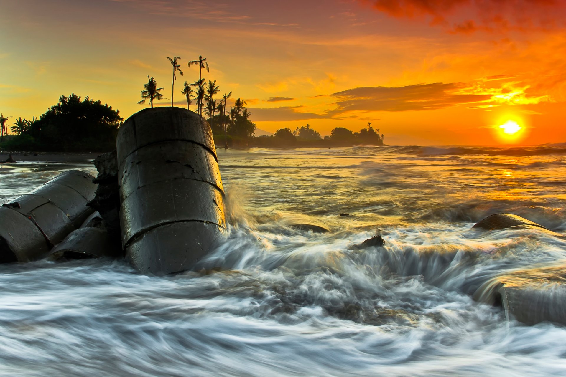 Fässer im Meer bei Sonnenuntergang Hintergrund
