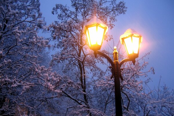 Winterabend. Brennende Laternen