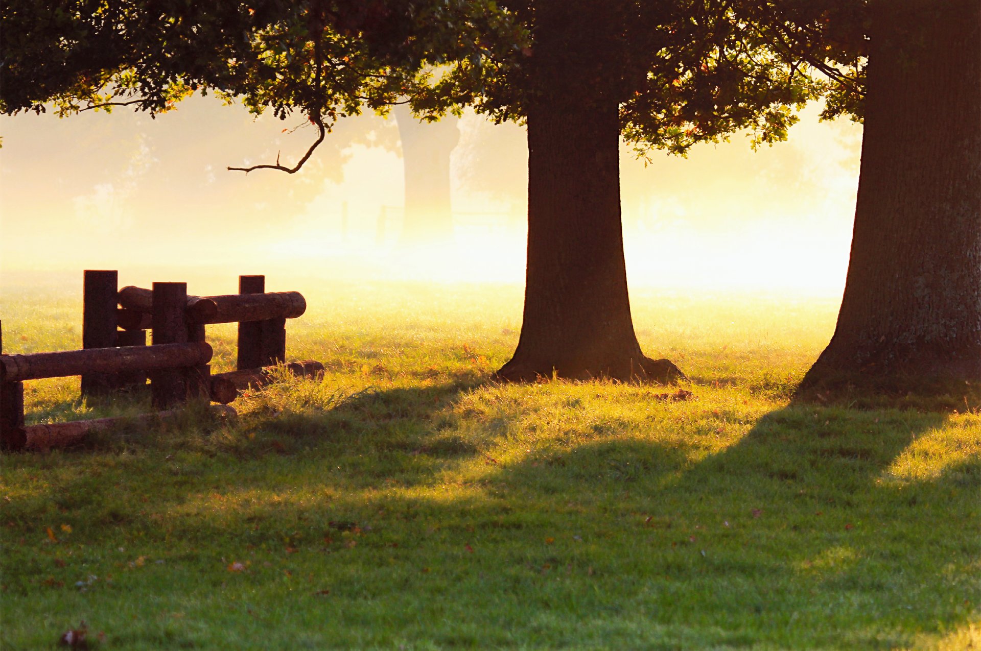 Herbstmorgen mit Eichen und Gras