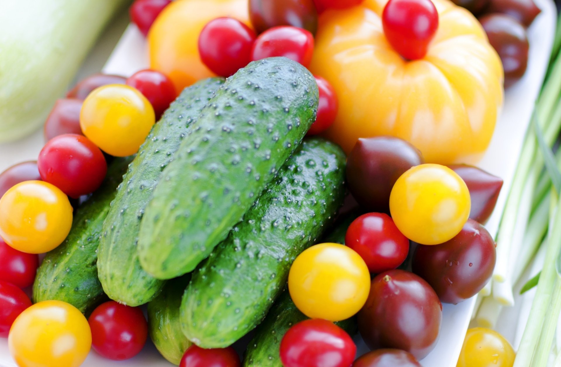 Bunte bunte Kirschtomaten und Gurken