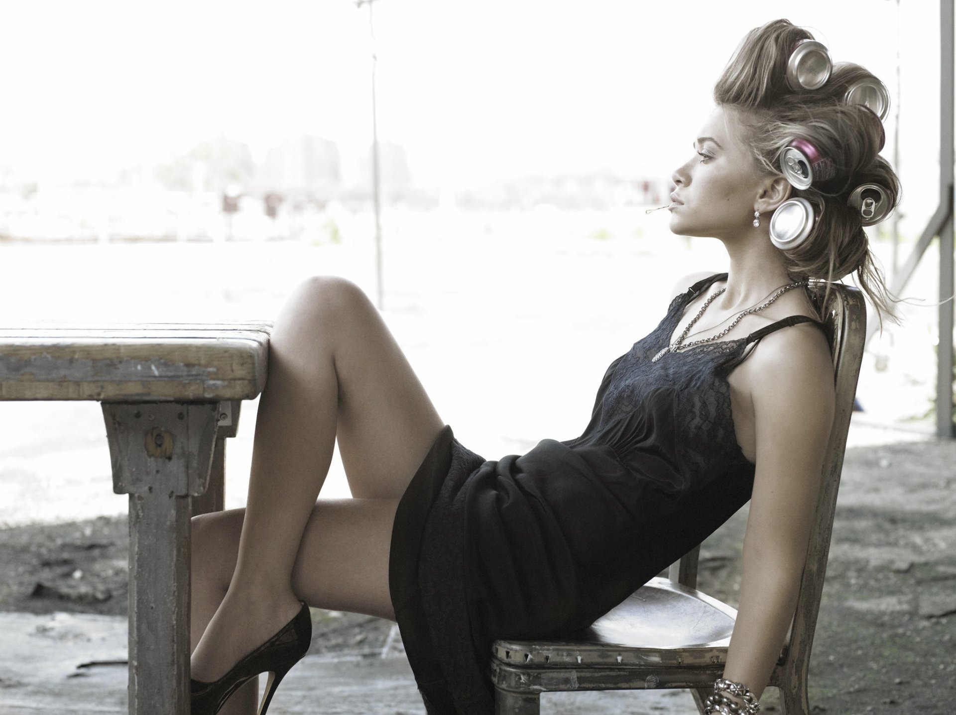 Elizabeth olsen ist auf einem stuhl. fuß auf fuß. neben dem tischElizabeth Olsen ist auf einem Stuhl. Fuß auf Fuß. Neben dem Tisch