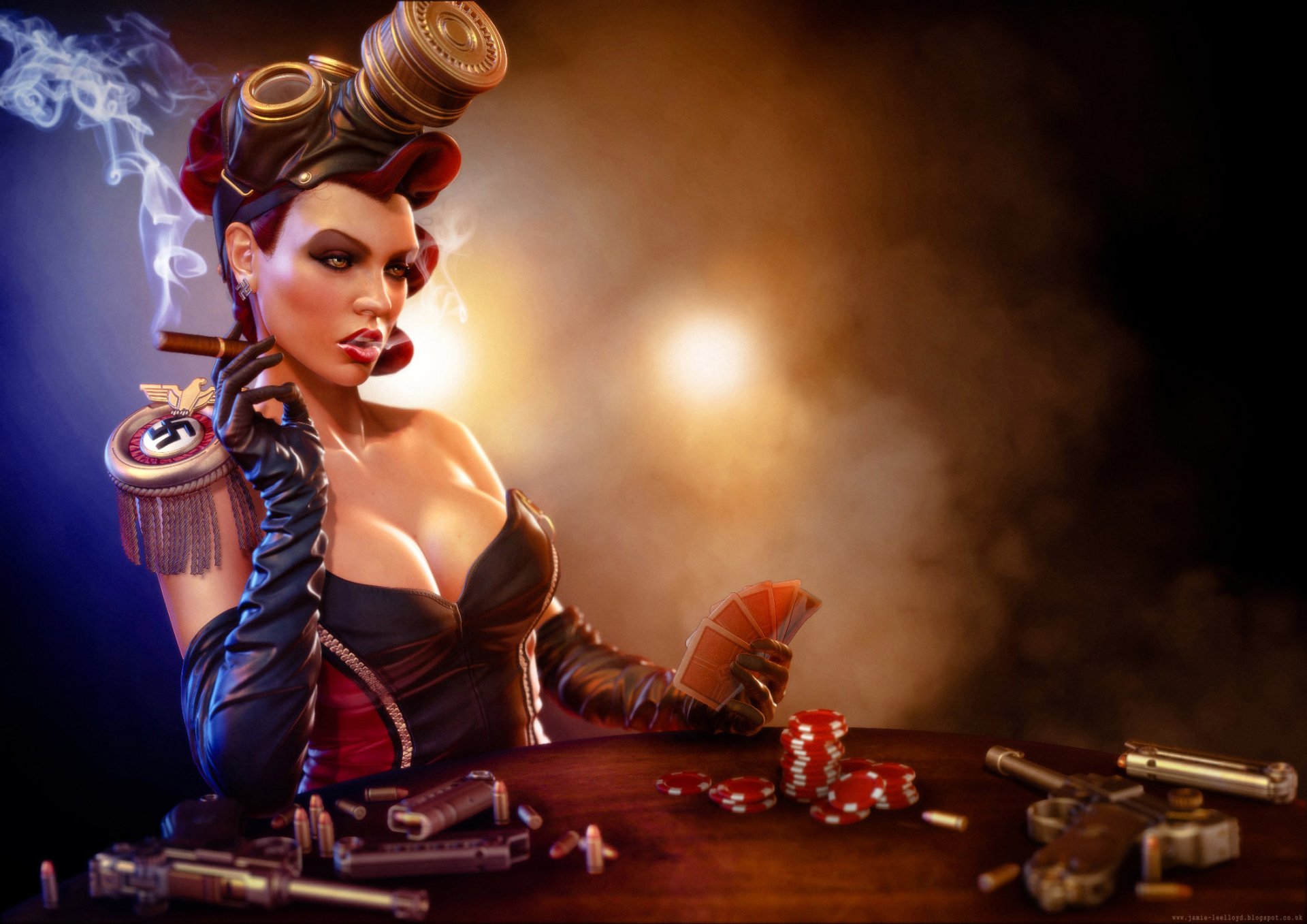 Madame in einer Gasmaske am Spieltisch