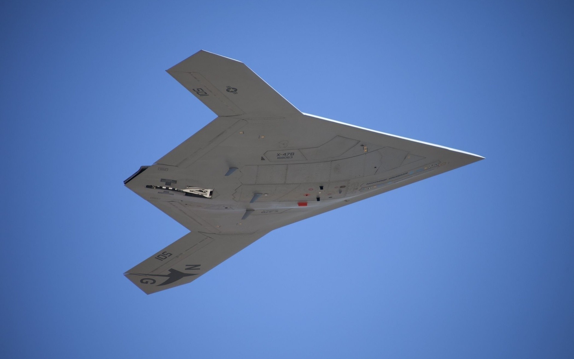X 47b Kampfdrohne während des Fluges, Ansicht von unten