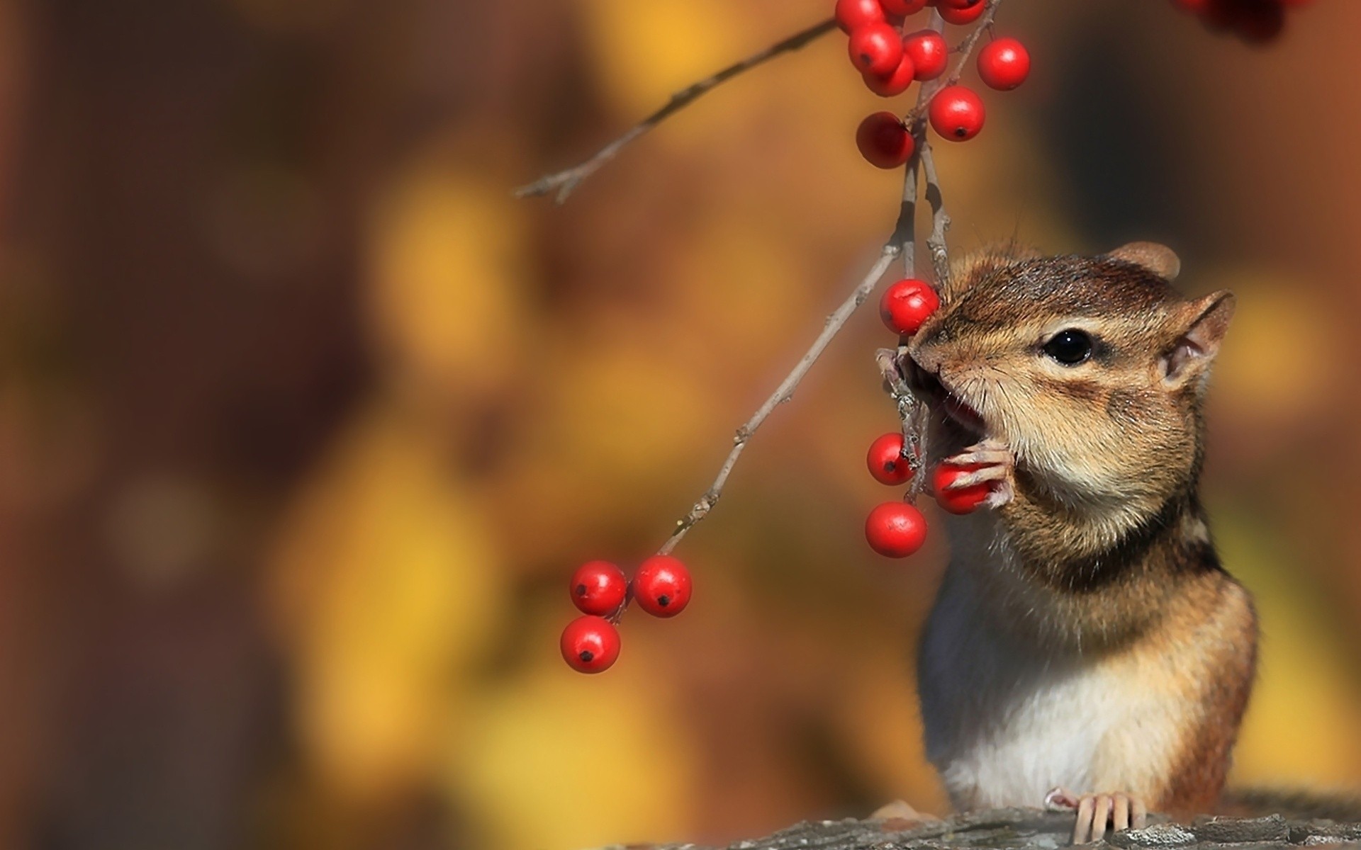 Chipmunk mit eberesche beere auf gelbem hintergrundChipmunk mit Eberesche Beere auf gelbem Hintergrund