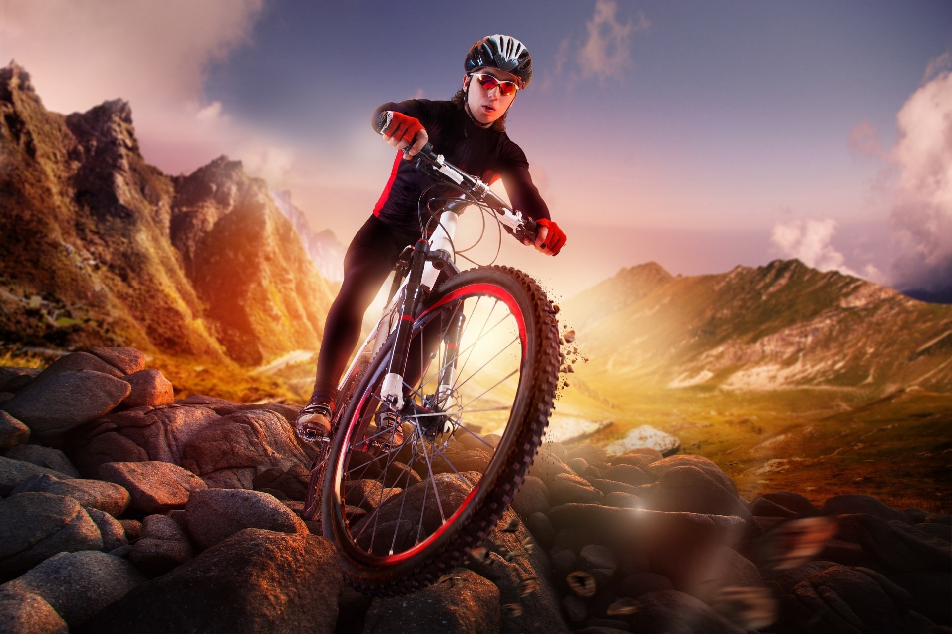Eine bezaubernde Landschaft, ein Radfahrer auf einem Berg