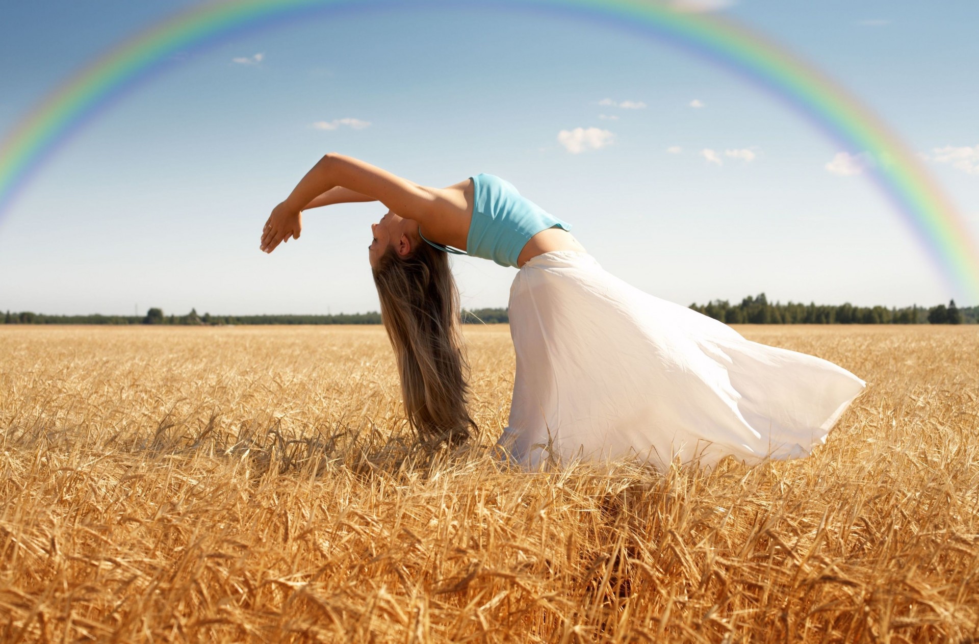 Mädchen im langen rock im feld mit ähren. regenbogenMädchen im langen Rock im Feld mit Ähren. Regenbogen