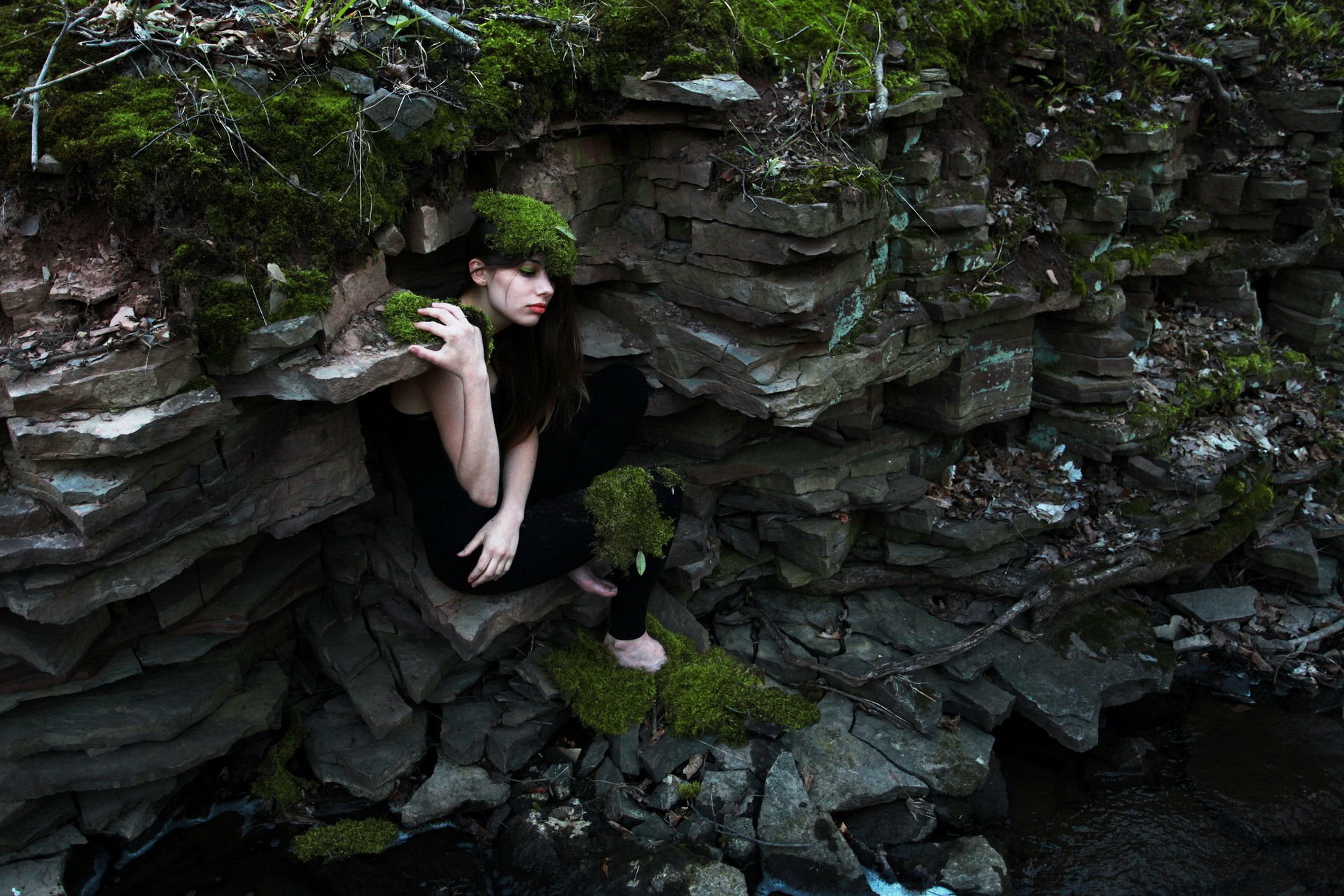 Das Mädchen am Felsvorsprung ist mit Moos bedeckt