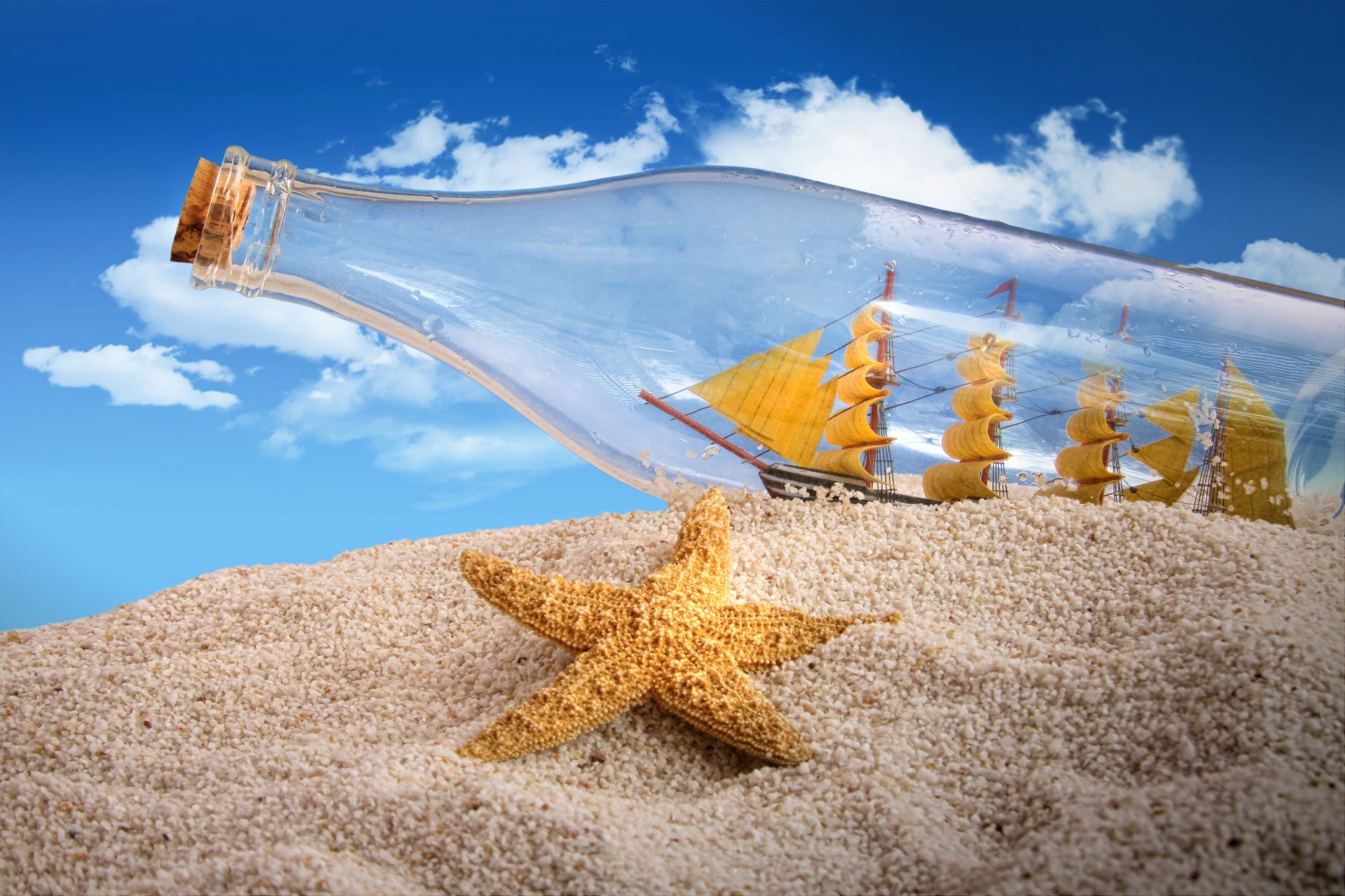 Flasche mit einem Boot am Sandstrand