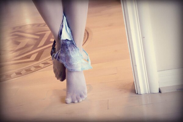 Schöne beine mit durchbrochenem höschen, das auf ihnen gesenkt wird