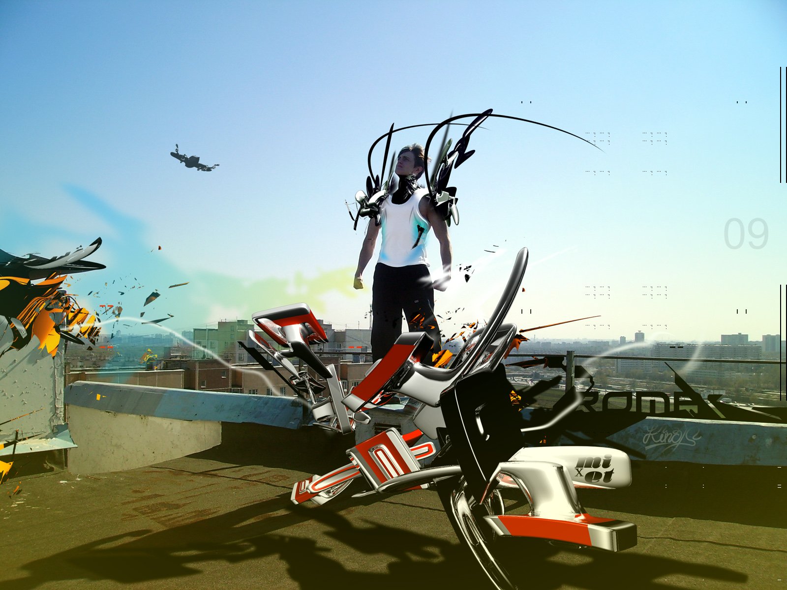 Futuristisches Cartoon-Bild eines Mannes auf dem Dach