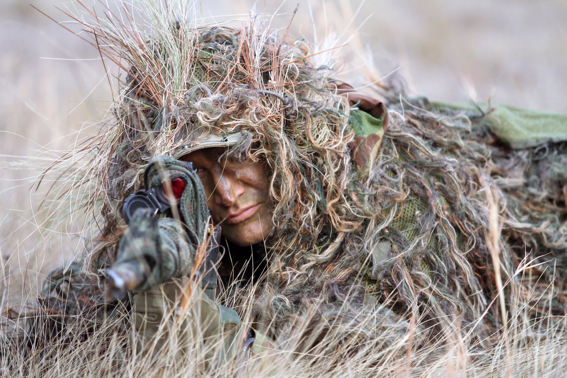 Der scharfschütze ist mit gras verkleidet und zielt auf ein gewehrDer Scharfschütze ist mit Gras verkleidet und zielt auf ein Gewehr