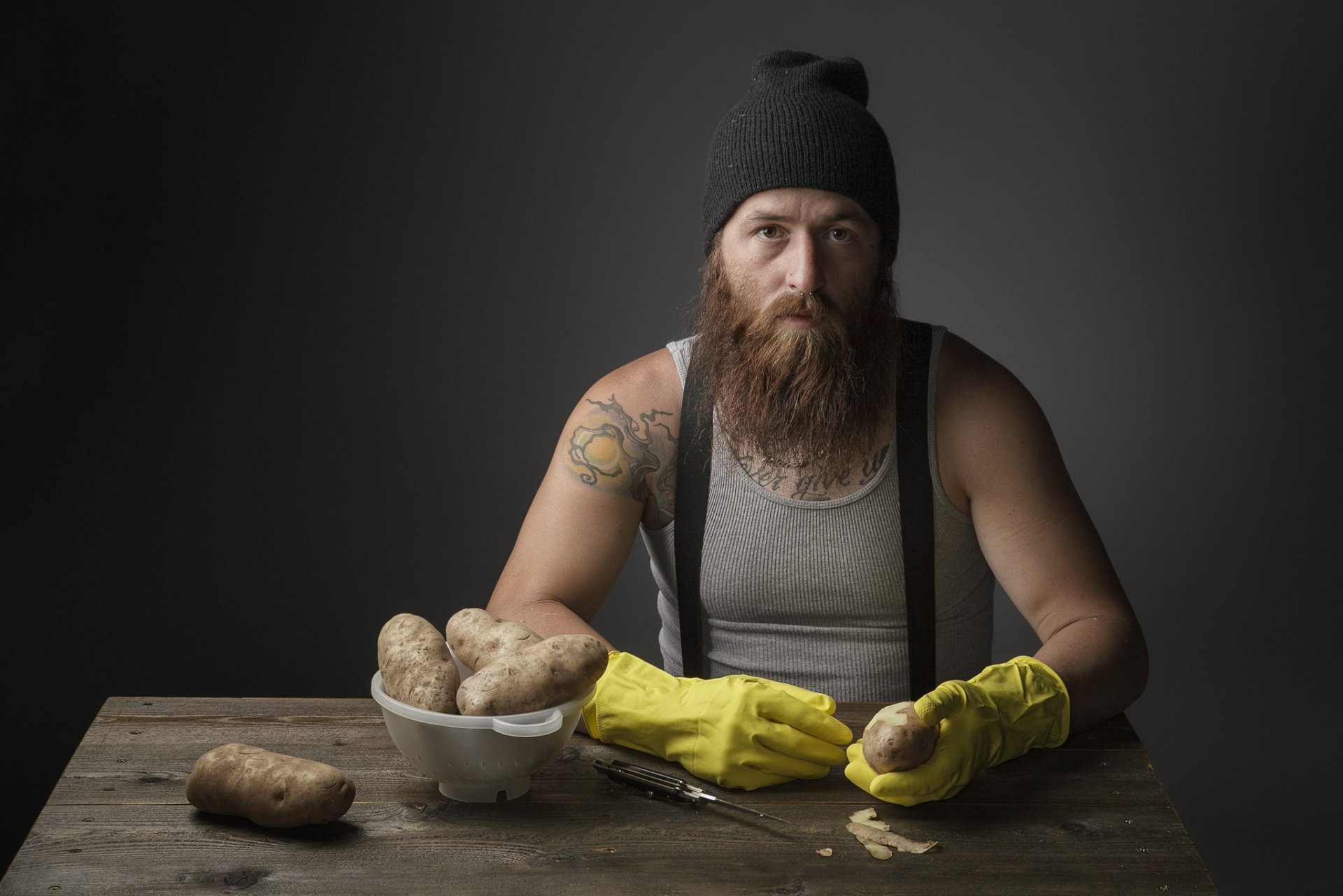 Ein Mann in einer Mütze putzt einen Hocker mit einem Messer