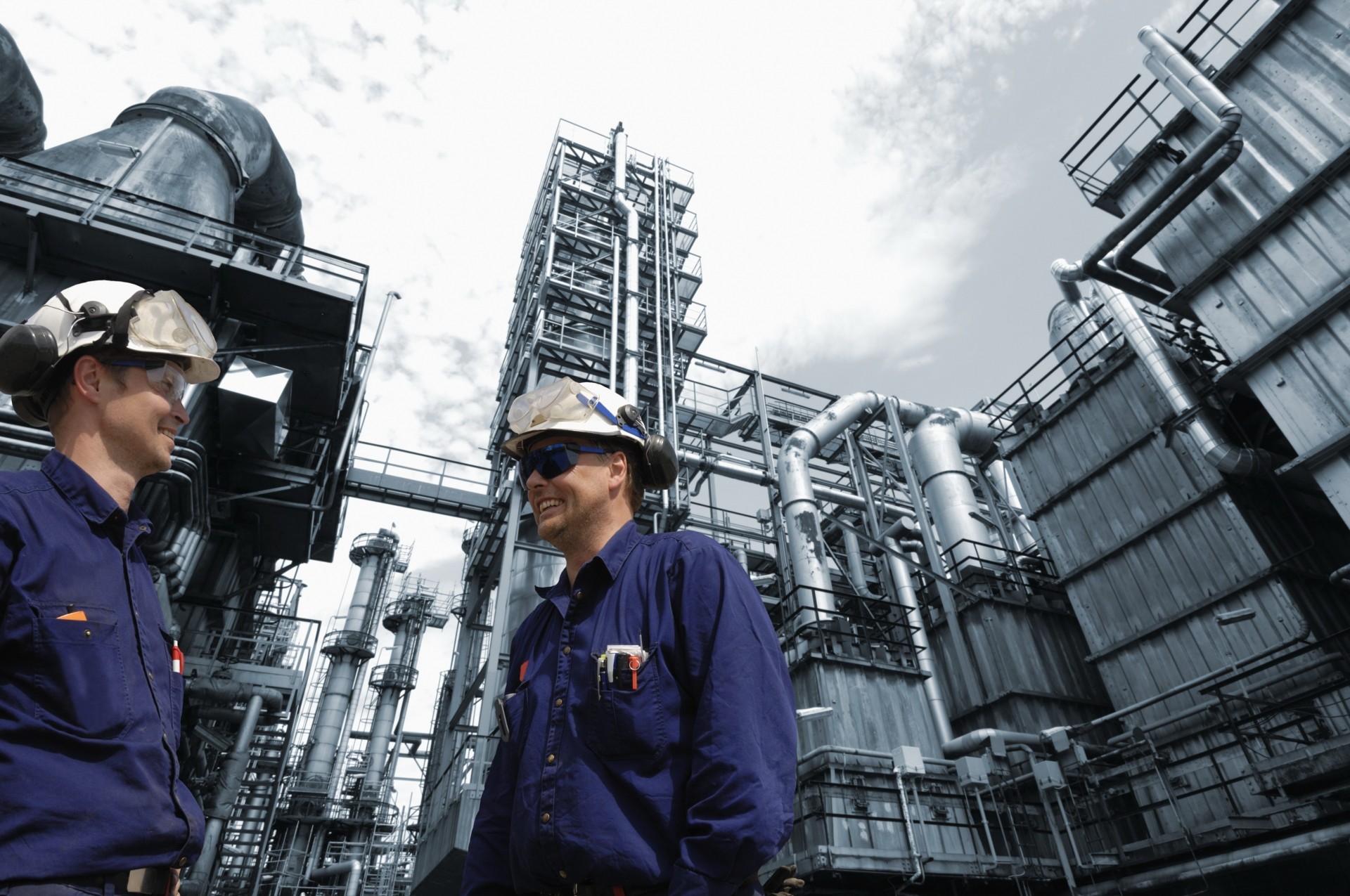 Ingenieure bei der Arbeit. Männer in Uniform vor dem Hintergrund eines Industriegebäudes