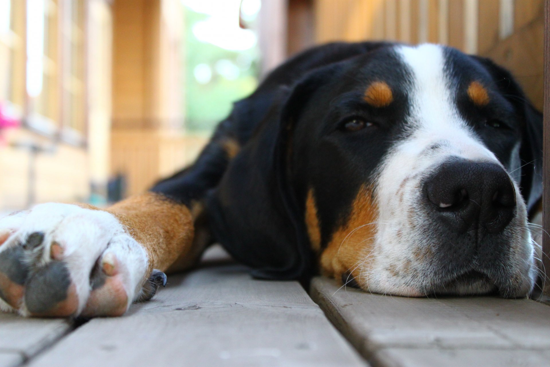 Schwarz-weißer Hund schnüffelt eine Schildkröte