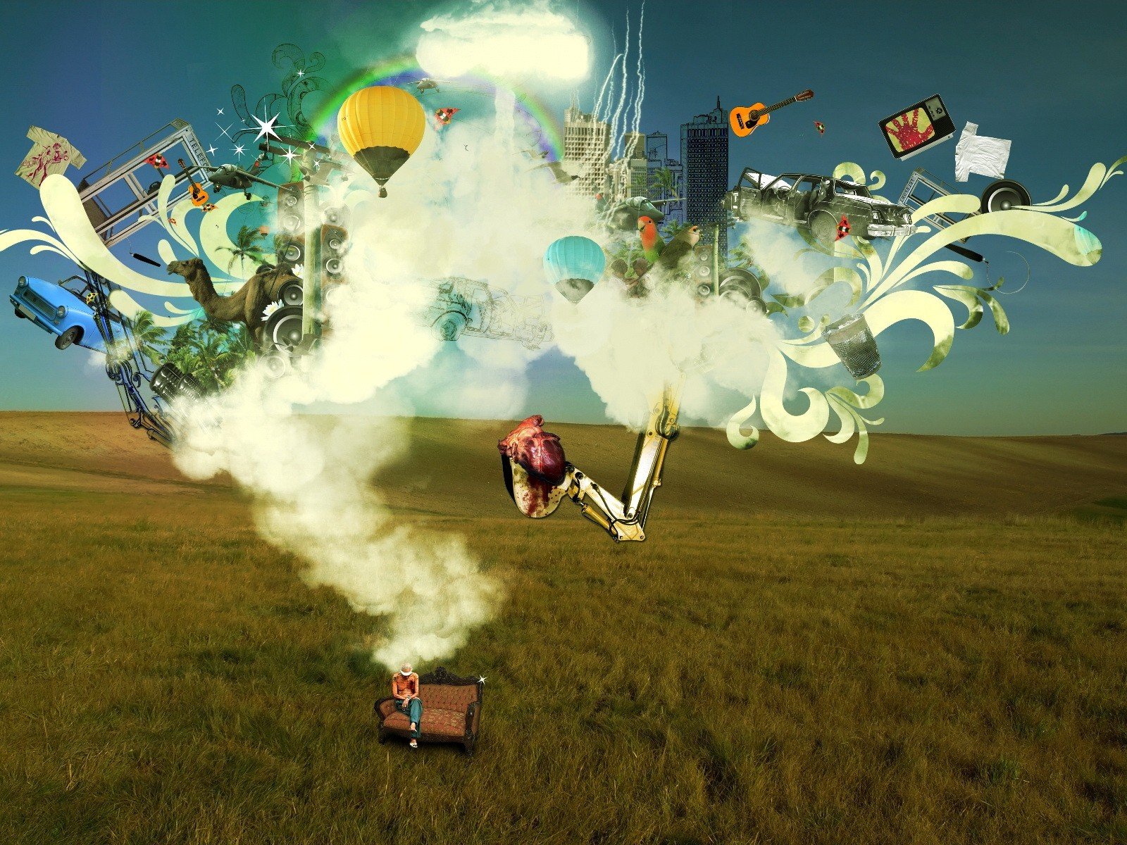 Gedanken eines mannes auf der couch, der im feld sitztGedanken eines Mannes auf der Couch, der im Feld sitzt