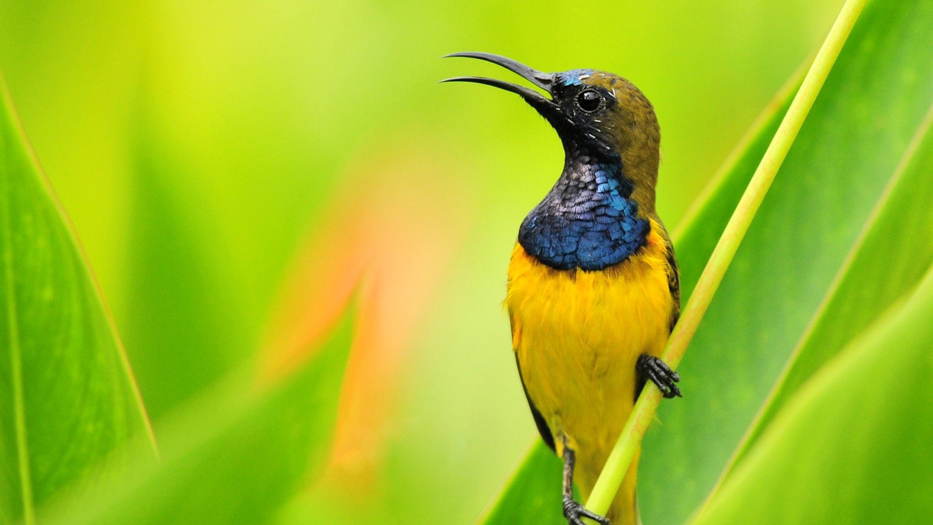 Vogel mit gelbem gefieder auf einem ast mit rosa blütenVogel mit gelbem Gefieder auf einem Ast mit rosa Blüten