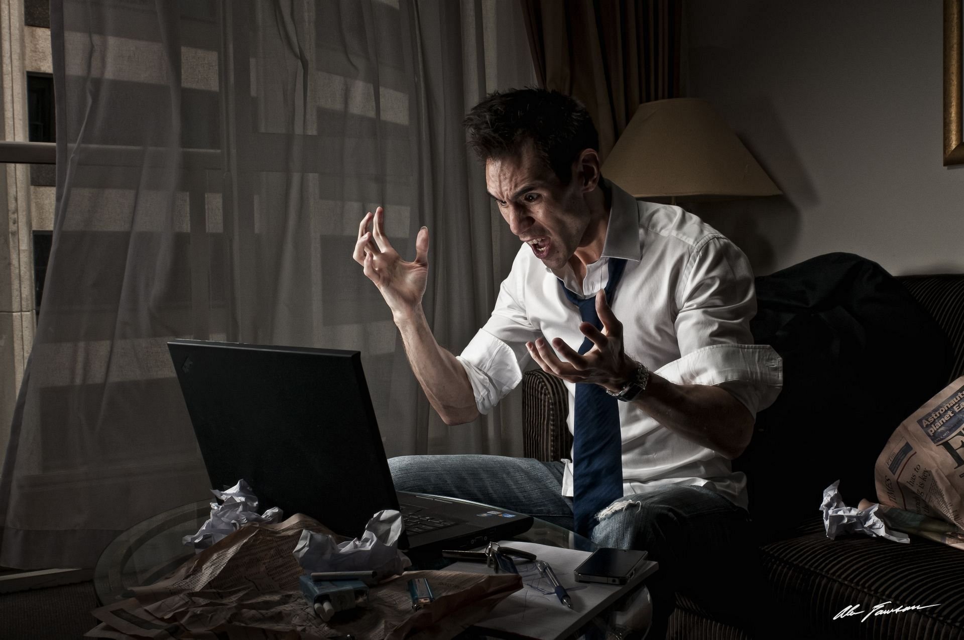 Mann ist am Abend verzweifelt wütend auf den Laptop