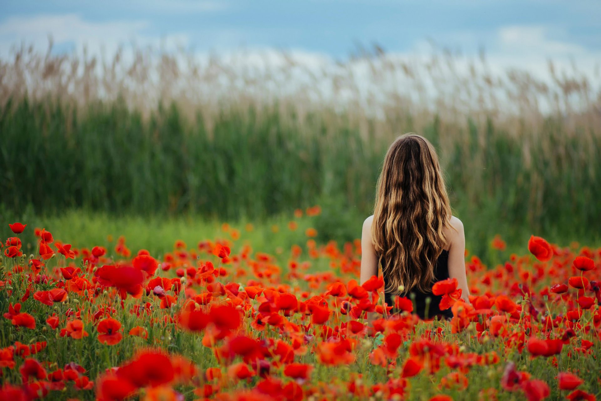 Mädchen auf dem hintergrund eines roten mohnfeldes in blumen